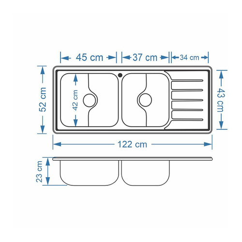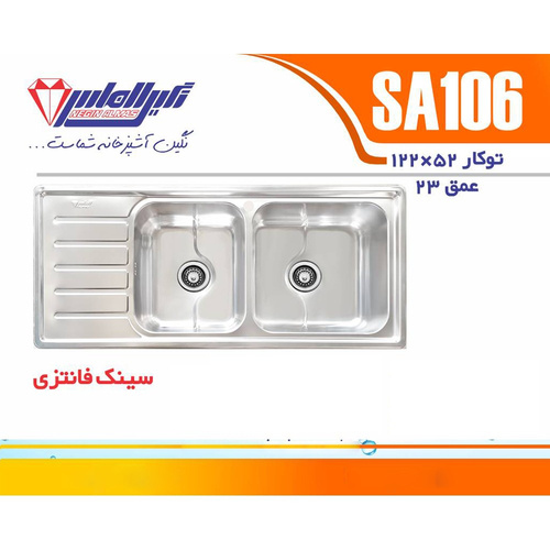 سینک ظرفشویی نگین الماس مدل SA106 توکار فانتزی با کیفیت، از جنس استیل ضد زنگ استیل 304 ساخته شده است. این سینک دارای دو لگن با عمق 22 سانتیمتر و ابعاد کلی 52×122 سانتیمتر میباشد که فضای مناسبی برای شستشوی ظروف فراهم میکند. ابعاد لگن بزرگ 42×45 و لگن کوچک 37×42 سانتیمتر به همراه سینی 32 سانتیمتر است و ظرفیت لگنها به ترتیب 36 و 29 لیتر با مجموع ظرفیت 65 لیتر است.