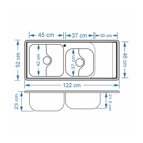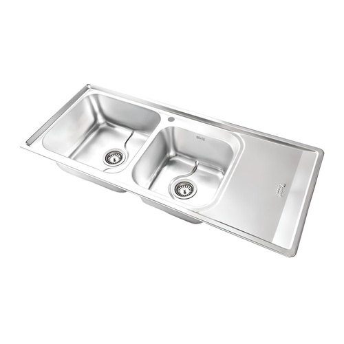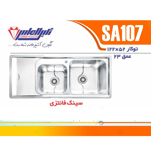 سینک ظرفشویی نگین الماس مدل SA107 توکار یک محصول فانتزی و با کیفیت از جنس ورق استنلس استیل 304 ضد زنگ است. ابعاد این سینک 52×122 سانتیمتر بوده و عمق لگن آن 22 سانتیمتر است که فضای کافی و عمق مناسب برای شستشوی انواع ظروف را فراهم میکند. این مدل دارای دو لگن بزرگ با ظرفیت مجموع 65 لیتر و یک سینی میباشد.